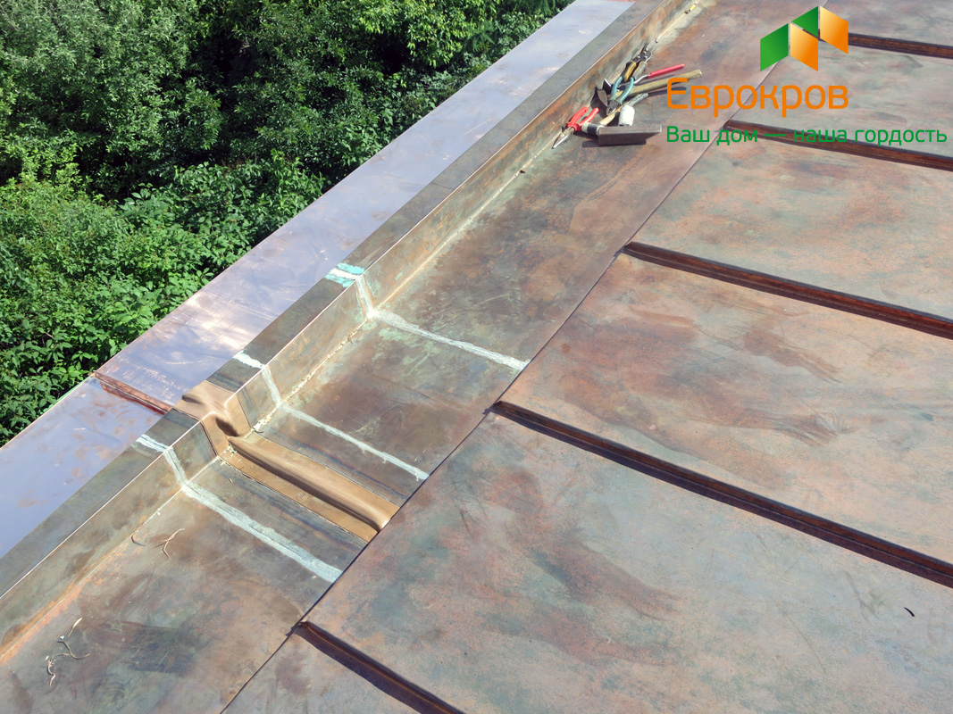 Монтаж встроенных водостоков из меди.
