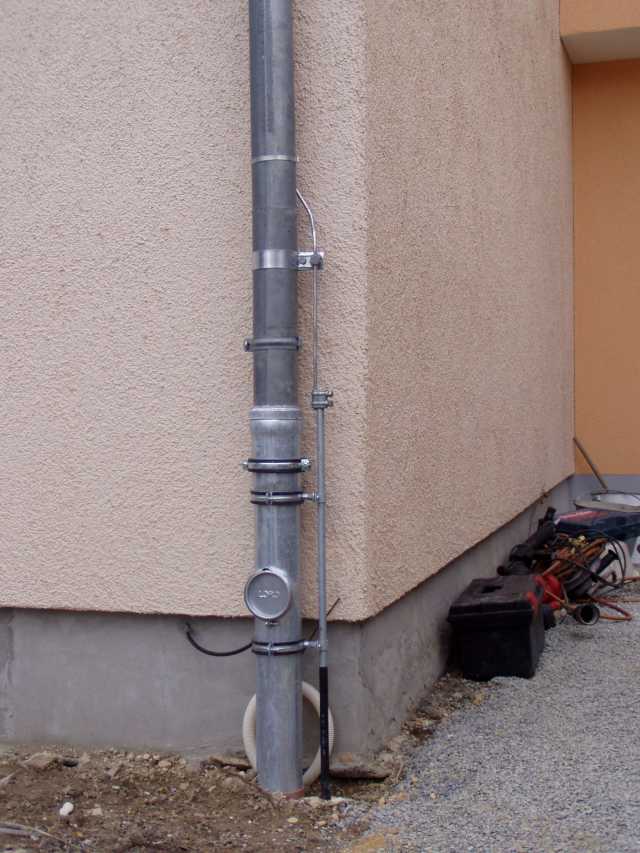 Стандартно - по обратной стороне трубы , с верху до низу идет штырь, который прикреплен к трубе- чтобы не болтался ( этот штырь является молниеотводом, а не водосточная труба) - В верху соединяется с системой молниеотведения кровельной , внизу - с шиной заземления... ну, а кто молниезащиту не ставит... тот - в лучшем случае - будет строить новый дом.