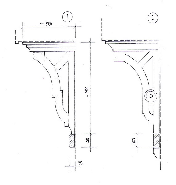 Прошу поделиться опытом монтажа резных кронштейнов-опор для карнизного свеса из дерева. В настоящий момент заканчиваем объект на котором присутствуют различные деревянные накладные элементы (наличники, деревянная лобовая доска и т.п.). Художник по нашей просьбе отрисовал эскизы. В настоящее время заканчиваются работы над шаблоном для передачи его на производство. Опоры быстро выпустят из производства, вопрос по их монтажу остается открытым. Крепление к стене понятное дело, а вот как крепить их в верхней части (требуется больше для защиты от ветра, чем на отрыв или сдвиг) софита. Конструкция следующая: лобовая доска представляет собой две доски высотой 200 мм и 150 мм крепится внахлест поверх первой, затем подшиваются карнизы и фронтоны алюминиевым софитом GENTEK, затем будут устанавливаться кронштейны. Главный вопрос: как закрепить кронштейны в их верхней части к софиту? Имеется у кого то подобный опыт реального монтажа? Может быть у кого то имеются эскизы, чертежи, узлы... Выкладываю эскизы кронштейнов, которые были предложены на выбор заказчику.