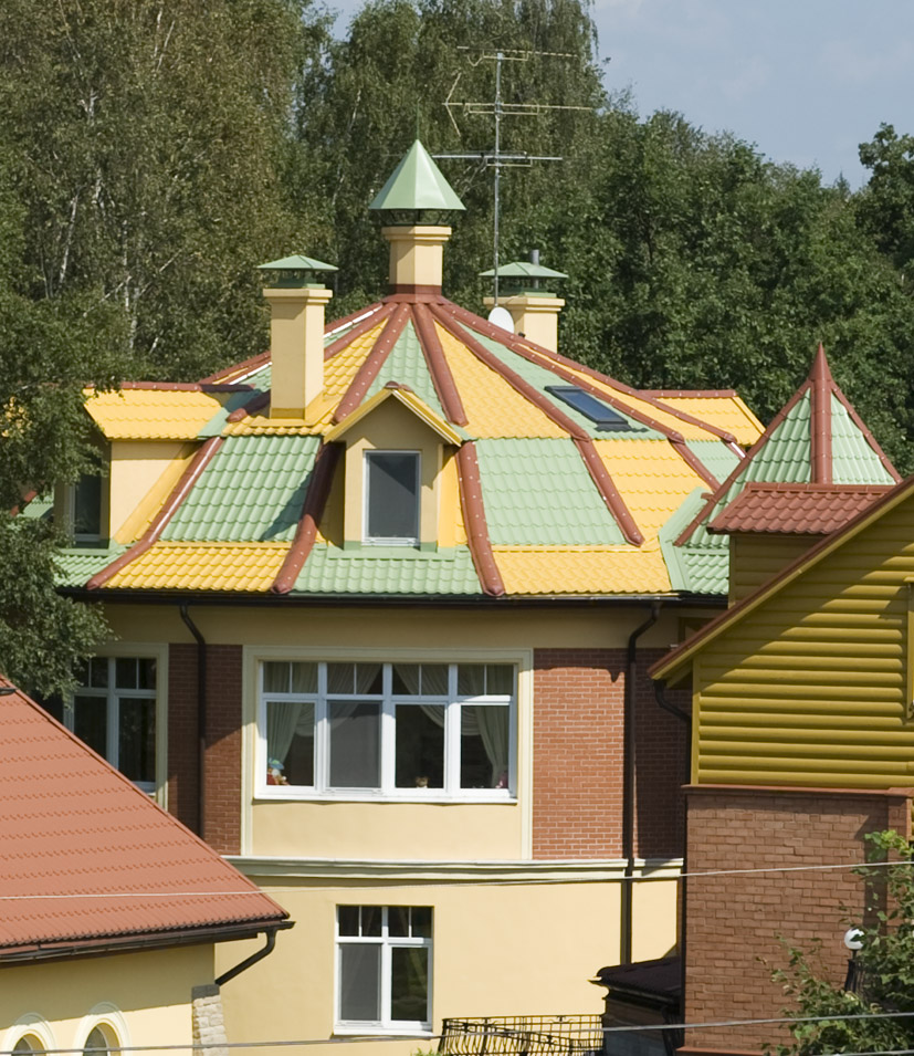 В своей практике встречал не мало кровель, где миксуется несколько цветов керамической черепицы. Видел объекты, где кровля с цементно-песчаной или битумной черепицей так же состояла из нескольких цветов. Но вот такое творчество с металлочерепицей увидел впервые.