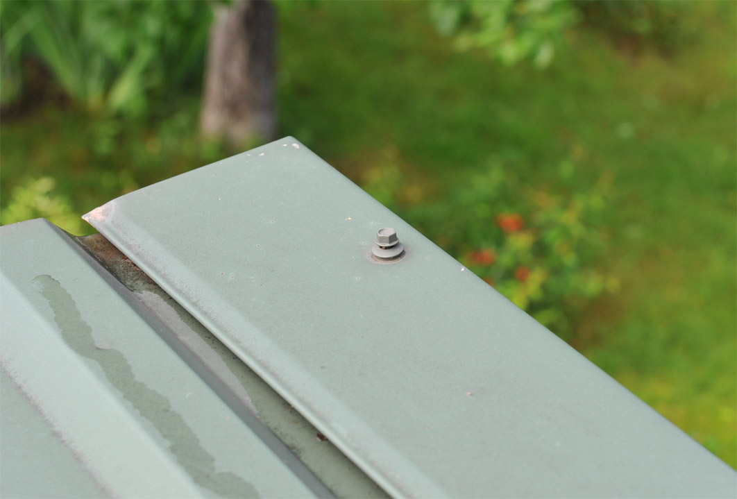 Побывал на инспекции кровли, смонтированной лет 5 назад. Заказчика напрягло то, что некоторые саморезы начали приподниматься над кровлей. Выкладываю несколько фото с кровли. Особенно сильно саморезы приподняты на фронтонных планках. На многих саморезах стали разрушаться резиновые уплотнители....