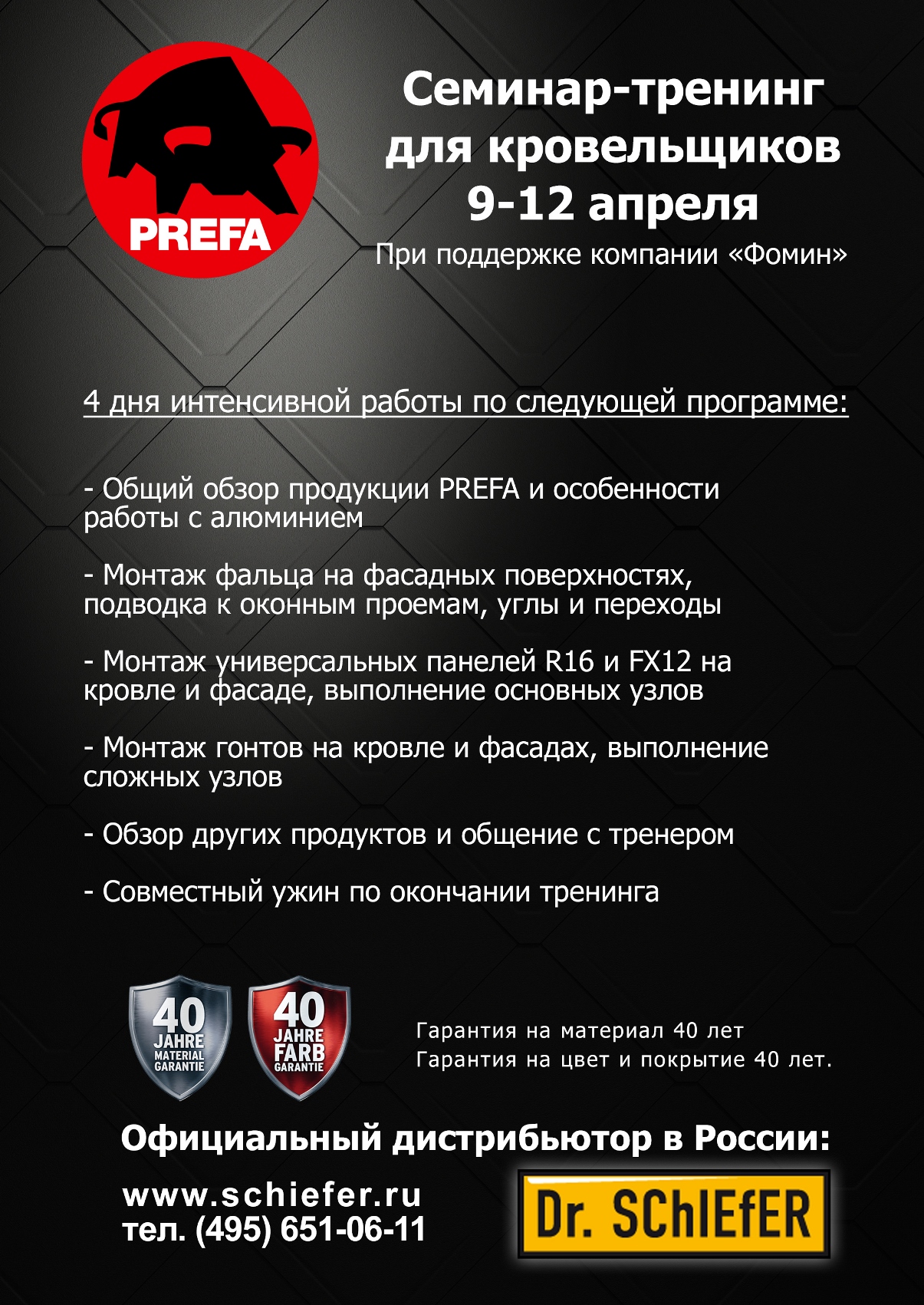 Семинар-тренинг (9-12 апреля 2018 года) для кровельщиков по работе с алюминием организован компаниями "PREFA" и "Dr. Schiefer" при поддержке компании "Фомин".