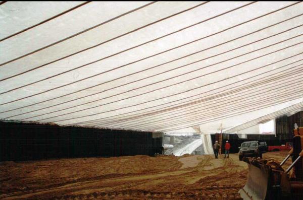 Что касается конструкции, то вопрос по каждому объекту индивидуален. В основном строительные леса (хомутовые), а перекрытия можно и нужно применять "фермы". Это как временные сцены устанавливают, что-то подобное. (См. фото. Зима и под пленкой), или заказывать что-то конкретное. Вопрос в разработке. Но заказ нужно под гарантированные заказы для сдачи в аренду. Сама конструкция например сцены стоят дорого (от 1,5 до 8 млн. руб). Долгоиграющий процесс окупаемости.