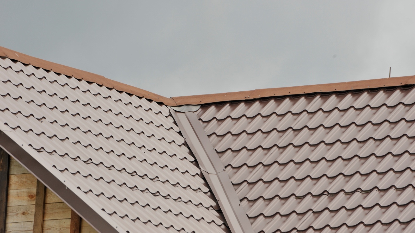 Издалека крыша этого домика смотрелась неплохо, за исключением отсутствия отблеска металлического конька. А оказалось, что он не "родной", а выполнен из ондулиноподобных материалов. При приближении выяснилось, что саморезов на кровле раза 2-2,5 меньше, чем должно быть, а ендова выполнена кое-как.
