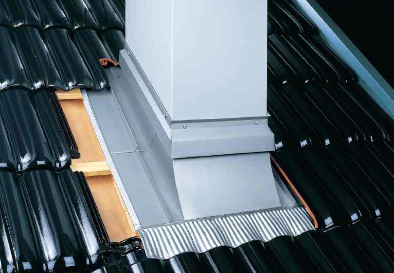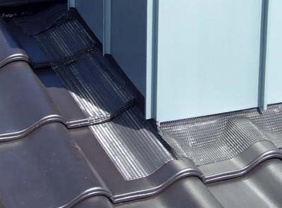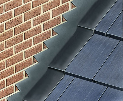 2. Укладка полосы из самоклеящегося алюминия/свинца или медных/свинцовых угловых пластин под каждую черепицу. Материал будет виден только на стене.
