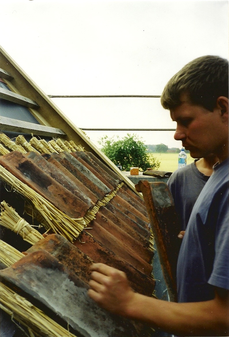 Коллеги, предлагаю вашему вниманию старую немецкую технологию укладки черепицы с уплотнением нахлёстов соломой.