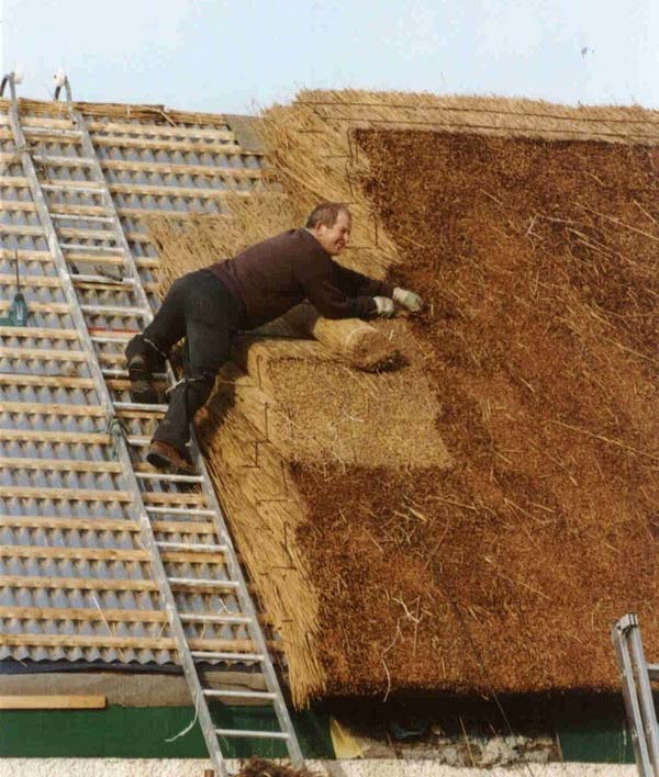Насколько я понял по фото, это кровля из дёрна, покрытая снаружи соломенной рогожкой с пригрузом.