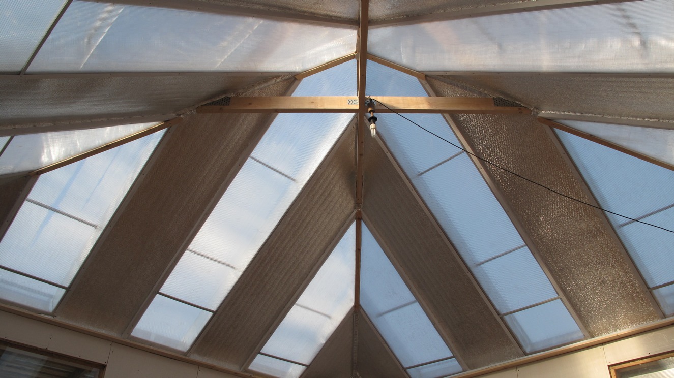Обращает на себя разница в толщине кровельного пирога. Поликорбанатный сендвич - около 200 мм, а утеплитель вокруг - 100 мм. Вот уже проблема.