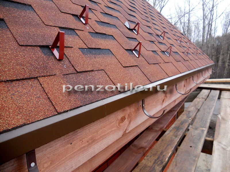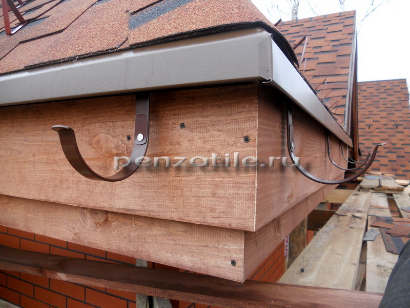 1. крючья желобов стоят очень низко по отношению к карнизной планке. Что, при укладке желобов приведет к тому, что между карнизной планкой и желобом образуется пространство, где на дерево будет постоянно задувать воду, следовательно - постоянно намокший карниз.