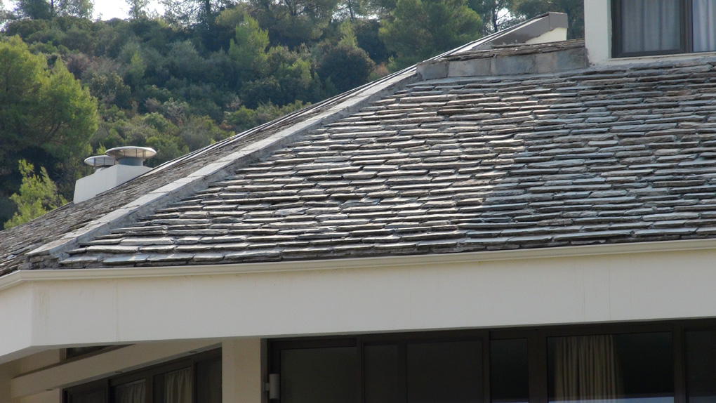 Интересный попался объект на глаза. Престижный жилой комплекс в курортном районе Греции. Кровля зданий покрыта камнем скорее всего сланцевых пород, хотя на 100% не уверен в этом. Издалека кровля смотрится солидно и гармонично. Однако при ближайшем рассмотрении выяснилось, что какой либо проработки кровельных узлов по сути нет.