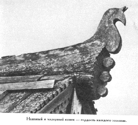 Далее по всей длине крыши в слеги с интервалами в метр-полтора врубаются деревянные крюки из молодых елей – курицы. В старину они действительно напоминали каких-то птиц. На эти крюки укладывались желоба – потоки. Они служили для отведения воды и для поддержания и крепления теса, которым покрывали скаты крыши. Стык тесин по верху закрепляли специальным бревном с пазом в нижней его части. Это то, что мне удалось узнать о самой технологии изготовления конька. А вот о формах конька (рисунков) я пока ничего не нашел. Может, кому-то повезло больше?