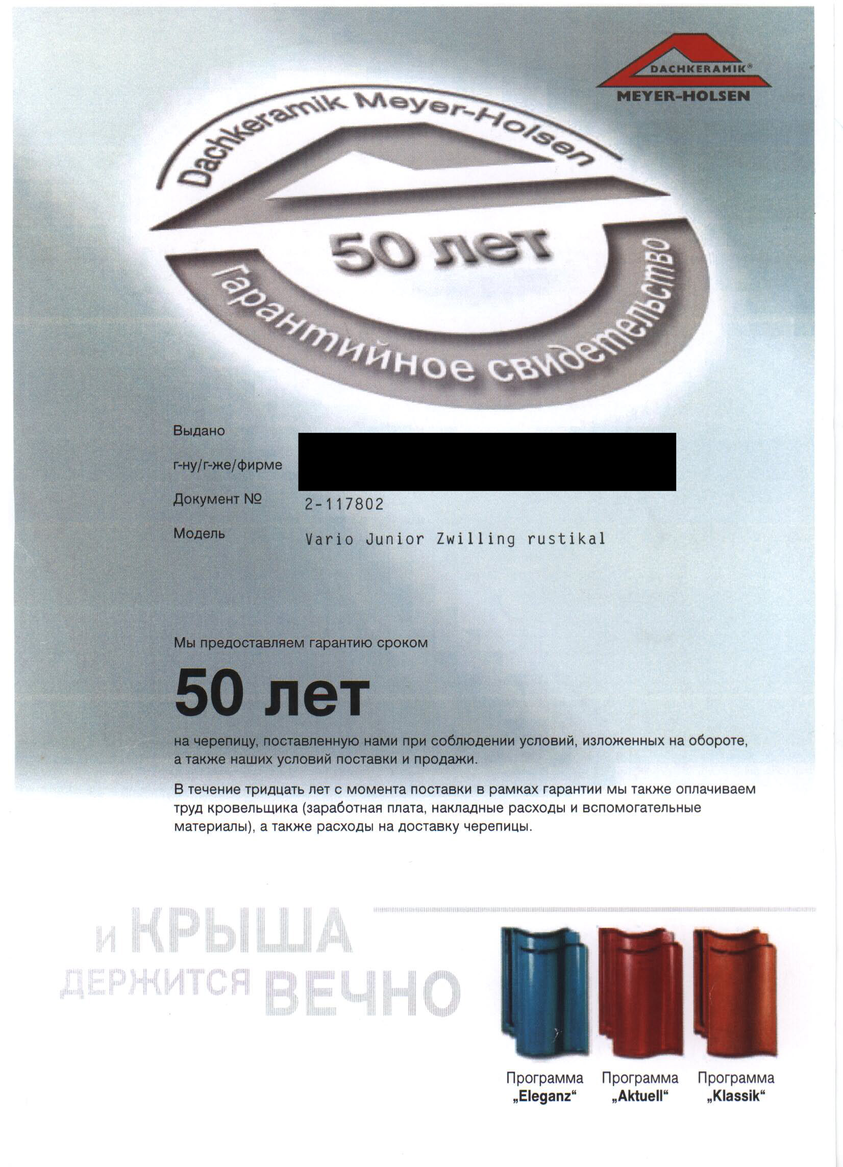 Гарантия на керамическую черепицу Meyer-Holsen на 50 лет